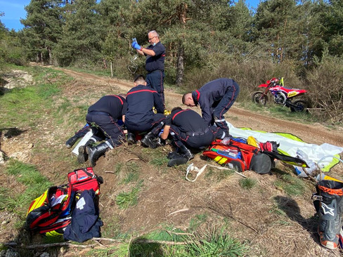 Salut à tous, ce 9 octobre 2022 avait lieu le traditionnel "enduro des régions" sur la commune de Bas en basset. Parcours enduro typique comme on les aime avec de superbes spéciales où les pilotes ont pu se faire plaisir sur les deux tours que comptait le parcours. Mais comme on le sait cela tient à peu de choses... Un pilote de 27 ans qui ne se sentait pas bien depuis quelques jours a fait un arrêt cardiaque sur le parcours à côté d’un Marshall pompier. Les premiers gestes de secours ont donc été réalisés sans perte de temps et les secours ont été dépêchés sur place, notamment Didier, médecin AMIS, qui était sur la spéciale numéro 2 avec son secouriste. Ils sont entrés rapidement dans la chaîne de secours et ont permis de réanimer le jeune pilote en arrêt cardio-respiratoire. Ce dernier a bien récupéré après un transfert héliporté sur le CHU de Saint-Étienne. Encore un exemple de la chaîne de secours qui est capitale, et une belle performance des AMIS pour réanimer un arrêt cardiaque dans les chemins. On souhaite un prompt et bon rétablissement au pilote et on remercie le secours apporté par nos amis les pompiers et la communication avec le SAMU de Saint-Étienne.