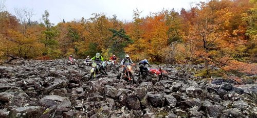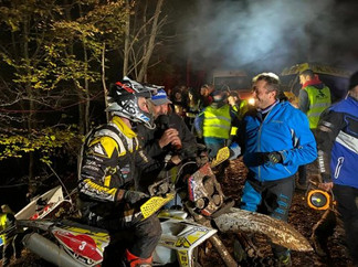 Les Xtrêmes sont à la mode, alors David et le MC de l’Emblavez y sont allés franchement… Le matin, direction Roche en regnier sur les hauteurs de Vorey camps de base de l’épreuve. Il neige, normal, on est en Novembre, et sur le sec c’est trop facile… Un enduro classique de sélection donnera l’ordre de départ pour l’après midi. Il y a du monde, outre les spécialistes, la moitié du parc sont des licences à la journée. Nous redoutons un peu les blessures, car il est clair que certains n’ont pas le niveau : ils ont le mérite d’essayer !!! Le matin se passe bien, Yann et moi avons 1 pilote avec un genou en vrac. Quand nous arrivons sur place, Yann commence l’examen, et demande si le pilote a retiré sa genouillère. Ce dernier répond qu’il roule sans : on hallucine !!! Il est vrai que dans le cahier des charges enduro, ce n’est pas précisé, mais quand même… 15h départ pour la boucle hard… Yann, les 2 Stéph’ et Renaud se lancent dans la bataille. Une boite avec 2 vitesses suffit largement… On est pas si mauvais, on passe !!! Renaud et Stéph’ se positionnent au CP 2, tandis que Yann et Stéph’ vont au CP 4 en haut d’une putain de côte de la mort…. 21h, ça caille à bloc (-4), c’est fini, on rentre par la route, mon nez et mes oreilles sont tombées à cause du gel… La nuit avec le phares au fond des bois restent un moment magique… C’était bon, David, si tu fais en 2020, on revient, c’est sûr !!!! La saison est maintenant terminée, longue mais bonne…. Merci à nos fidèles partenaires, sans qui toutes les médicalisations ne pourraient se faire.